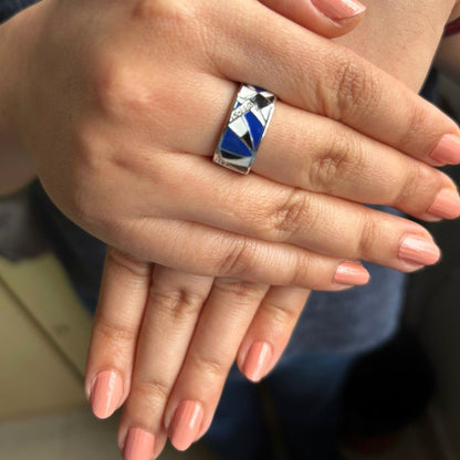 925 Silver Abstract Essence Enamel Ring - Blue and Black